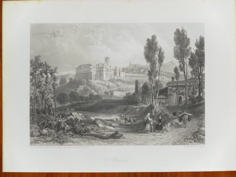 Rara veduta di Assisi. Epoca: 1864 Tecnica: bulino su acciaio Misura pagina: 300 x 220 mm. Misura incisione: 225 x 160 mm. Condizioni: eccellenti, retro bianco.